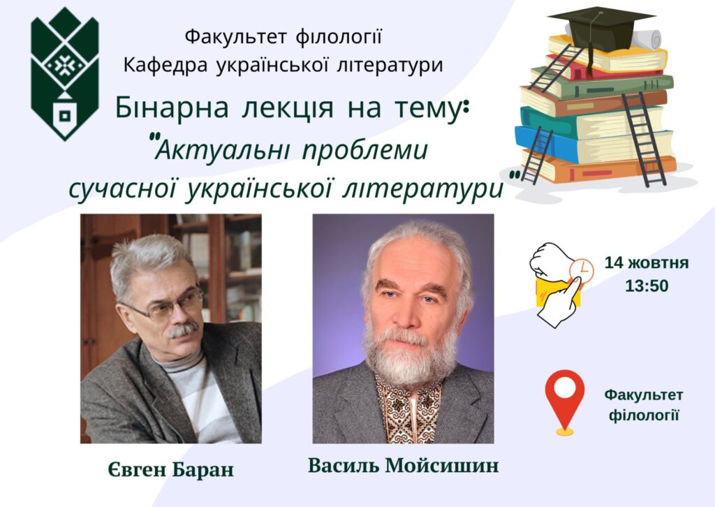 14 жовтня о 13:50 на Факультеті філології відбудеться бінарна лекція доцента кафедри української літератури Барана Євгена та професора, дійсного члена Наукового товариства ім. Т. Шевченка Мойсишина Василя на тему: “Актуальні проблеми сучасної української літератури”.